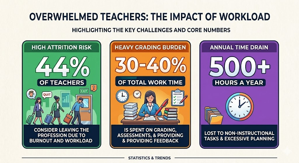 For a teacher managing 150+ students, grading can exceed 500 hours a year. Those hours come from evenings, weekends, and holidays — slowly eroding recovery time and long-term sustainability.